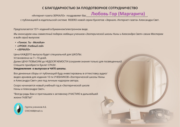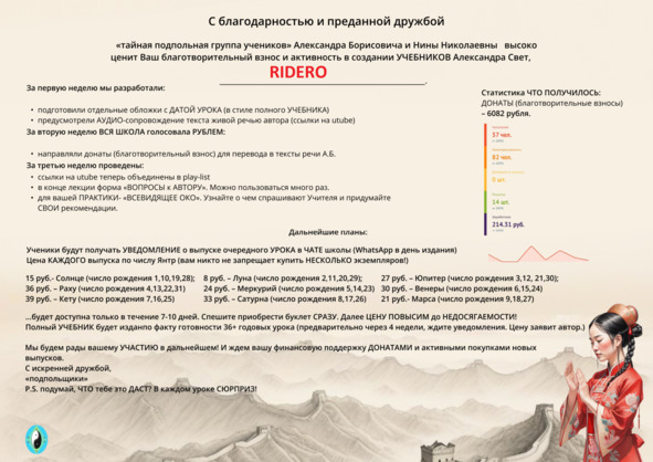 Все денежные сборы от публикаций будут инвестированы в оТТекстовку аудио/видео архивов «Эзотерической школы Нины и Александра Свет».
