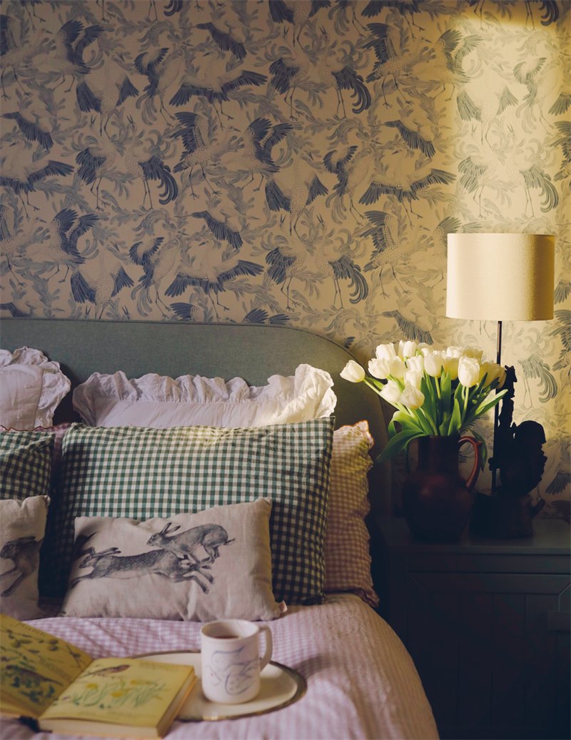 Добавляю на кровать пару подушек с птицами, постельное белье заменяю на яркое.