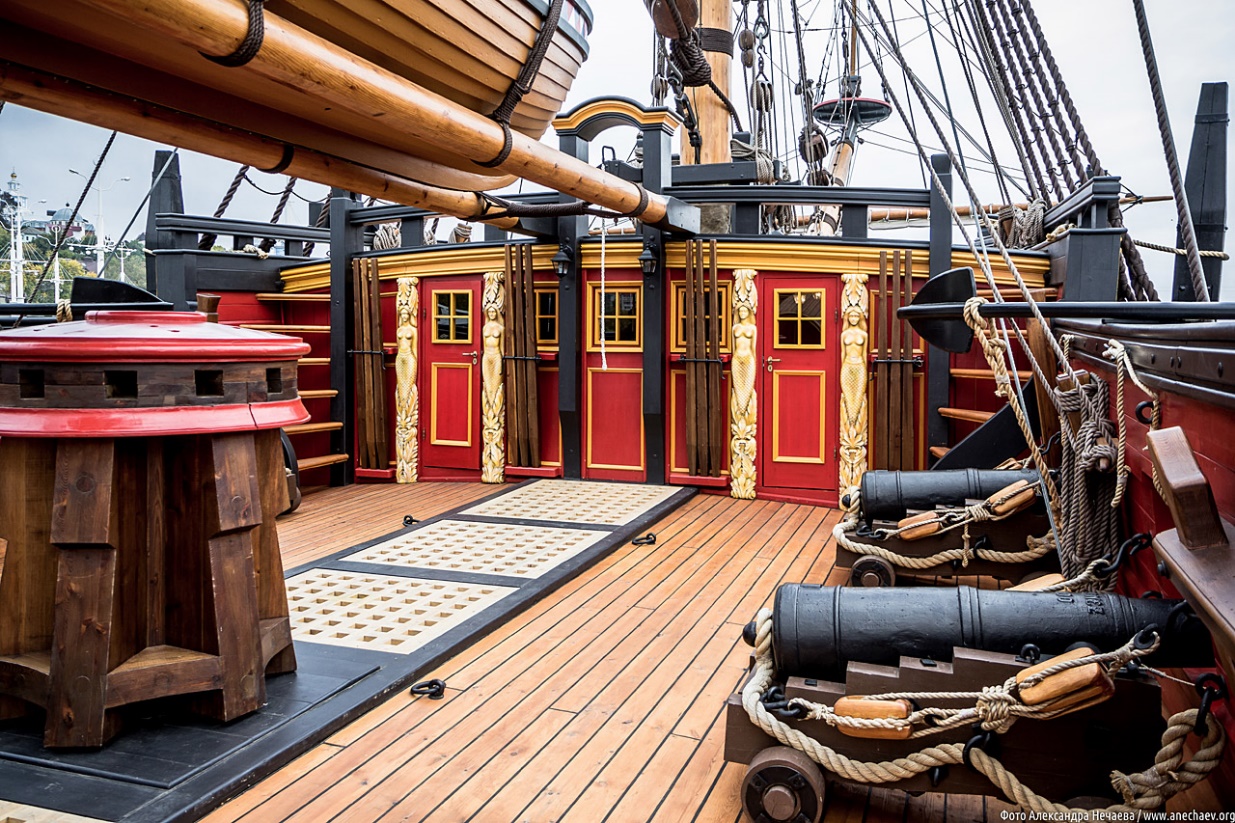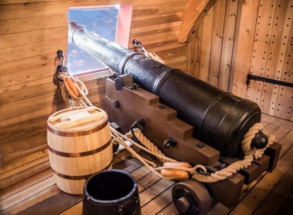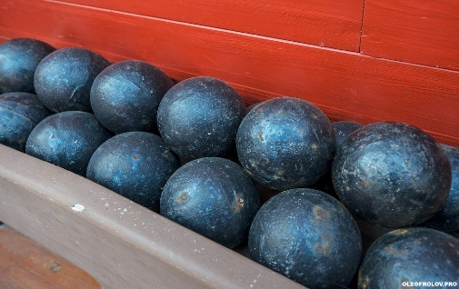 Бомбардир прекрасно знал свое дело и каждый день осматривал свое пушечное хозяйство. Стрельба из пушки требовала умения и не дюжей физической силы. Перед стрельбой нужно было перекатить пушку в боевое положение, установить ядро (самые тяжелые около 6 кг), насыпать порох, уплотнить порох пыжом3. Только самые опытные бомбардиры могли точно прицеливаться при маневрировании корабля. Так выглядели пушки на верхней палубе.
