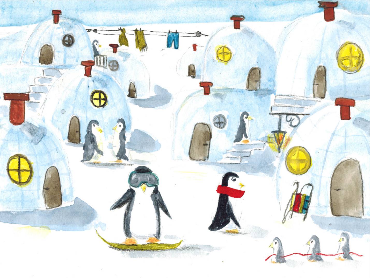 Жили пингвины небольшой дружной стаей в домиках изо льда. Все семьи старались поддерживать тёплые, добрососедские отношения. Птенчики появлялись из яиц, которые родители по очереди заботливо согревали своим телом.