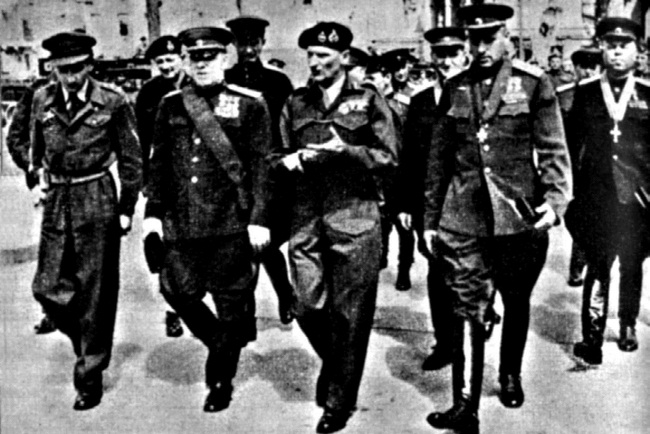 Г.К. Жуков, Б. Монтгомери, К.К. Рокоссовский в Берлине