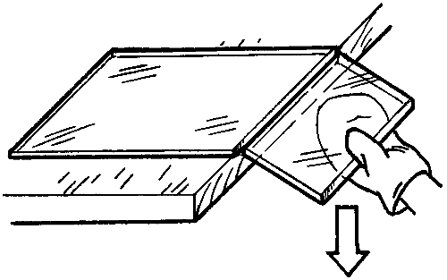 В процессе нарезки стекло должно издавать слабый потрескивающий звук. При правильной работе хорошим стеклорезом на нем должен остаться едва заметный бесцветный след. Прежде чем отломить стекло, под него на обоих концах подкладывают спички – это слегка приподнимет лист стекла и обеспечит ровный разлом. Затем располагают его так, чтобы линия разреза приходилась на край стола, и разламывают руками (рис. 2).
