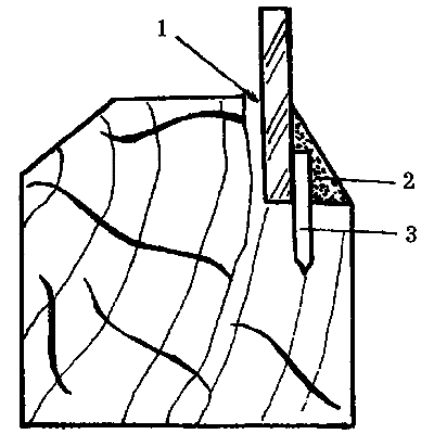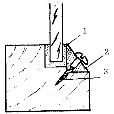 Рис. 4. Вставка стекла на одинарной замазке: 1 – зазор; 2 – замазка; 3 – шпилька