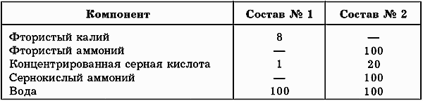 В составе № 1 серную кислоту можно заменить соляной или уксусной, при этом количество фтористого калия следует увеличить до 18 массовых долей. После обработки стекло становится слегка матовым.