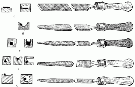 Рис. 9. Наиболее распространенные напильники и их применение: а – плоский; б – полукруглый; в – квадратный; г – трехгранный; д – круглый.