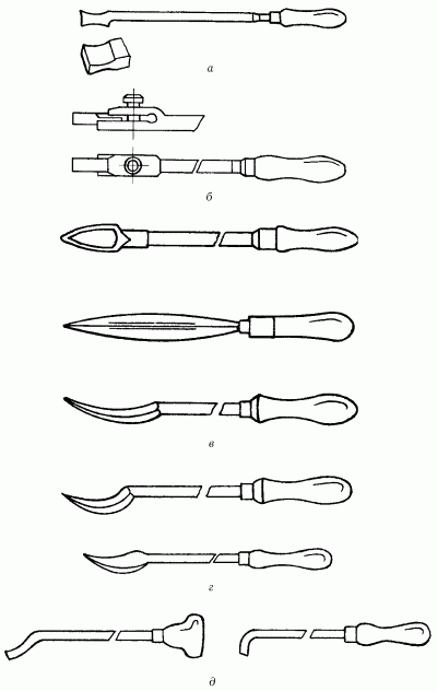 Рис. 11. Шаберы: а – плоский; б – со вставной пластинкой из твердого сплава; в – трехгранные; г – двухгранные (скребки); д – фасонные.