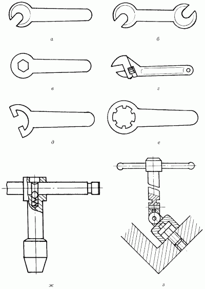 Рис. 13. Ручной инструмент для сборки резьбовых соединений. Ключи: а – односторонний; б – двухсторонний; в – накладной; г – разводной; д – накидной открытый для круглых гаек; е – накидной закрытый для круглых гаек; ж – торцовый; з – торцовый шарнирный.