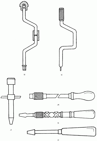 Рис. 13 (продолжение). Ручной инструмент для сборки резьбовых соединений. Ключи: и – коловоротный. Отвертки: к – коловоротная; л – воротковая; м – с направляющей втулкой; н – реверсивная; о – обычная.