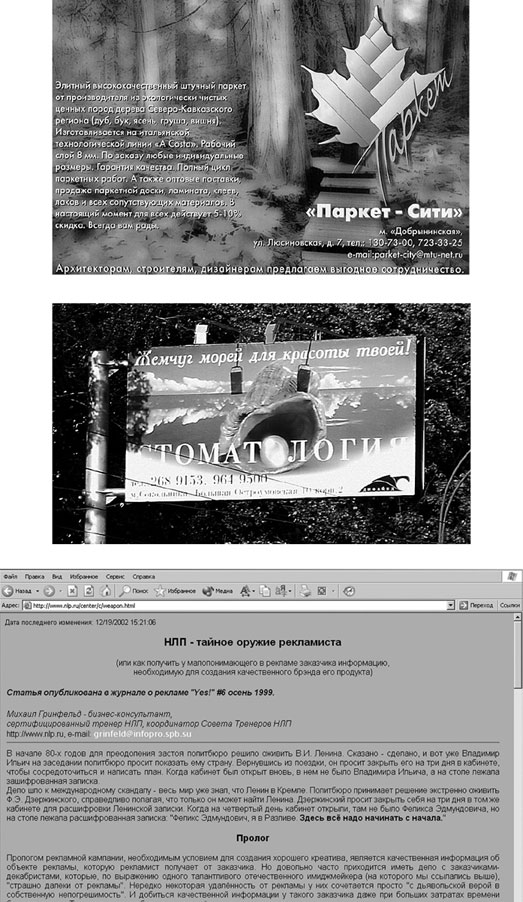 Далее, заказывая почти все услуги, вы в основном полагаетесь на опыт и квалификацию специалиста и не мешаете ему своими непрошеными советами. Иное дело реклама – тут всяк «специалист»! В рекламе (по мнению многих) все до смешного элементарно: раньше было «Летайте самолетами Аэрофлота», сейчас «Пейте Coca-Cola». Чего проще!