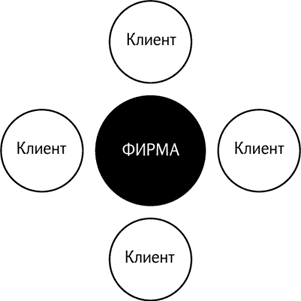 На рынке продавца никому не нужно помогать покупать. Да и думать о Клиенте тоже не нужно – а куда он денется. Для этого рынка характерно мировоззрение, в центре которого находится сама горячо любимая фирма. А вокруг нее вертятся какие-то там Клиенты (рис. 1).