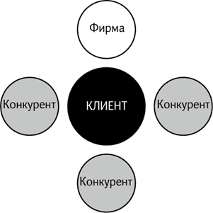 Здесь в центре – Его Величество Клиент, вокруг которого вращается ваша фирма вместе с множеством ваших конкурентов (рис. 2). Вам обязательно нужно понять, что для Клиента и ваша горячо любимая компания, и ваши продукты – это всего лишь одно из многих предложений на огромном рынке.