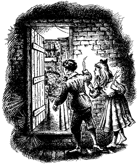 Проход был пыльным, и тёмным, и холодным. Полли и Дигори ступали с балки на балку молча, только иногда шептали: «Теперь твой чердак» или «Наш дом мы почти прошли». Они не споткнулись ни разу, и свечи у них не погасли, и дверцы в кирпичной стене они достигли, только на ней, конечно, не было ручки, потому что никто не входил в неё снаружи. Однако внутри ручка была, а снаружи торчал шпенёк (такой бывает внутри шкафа).