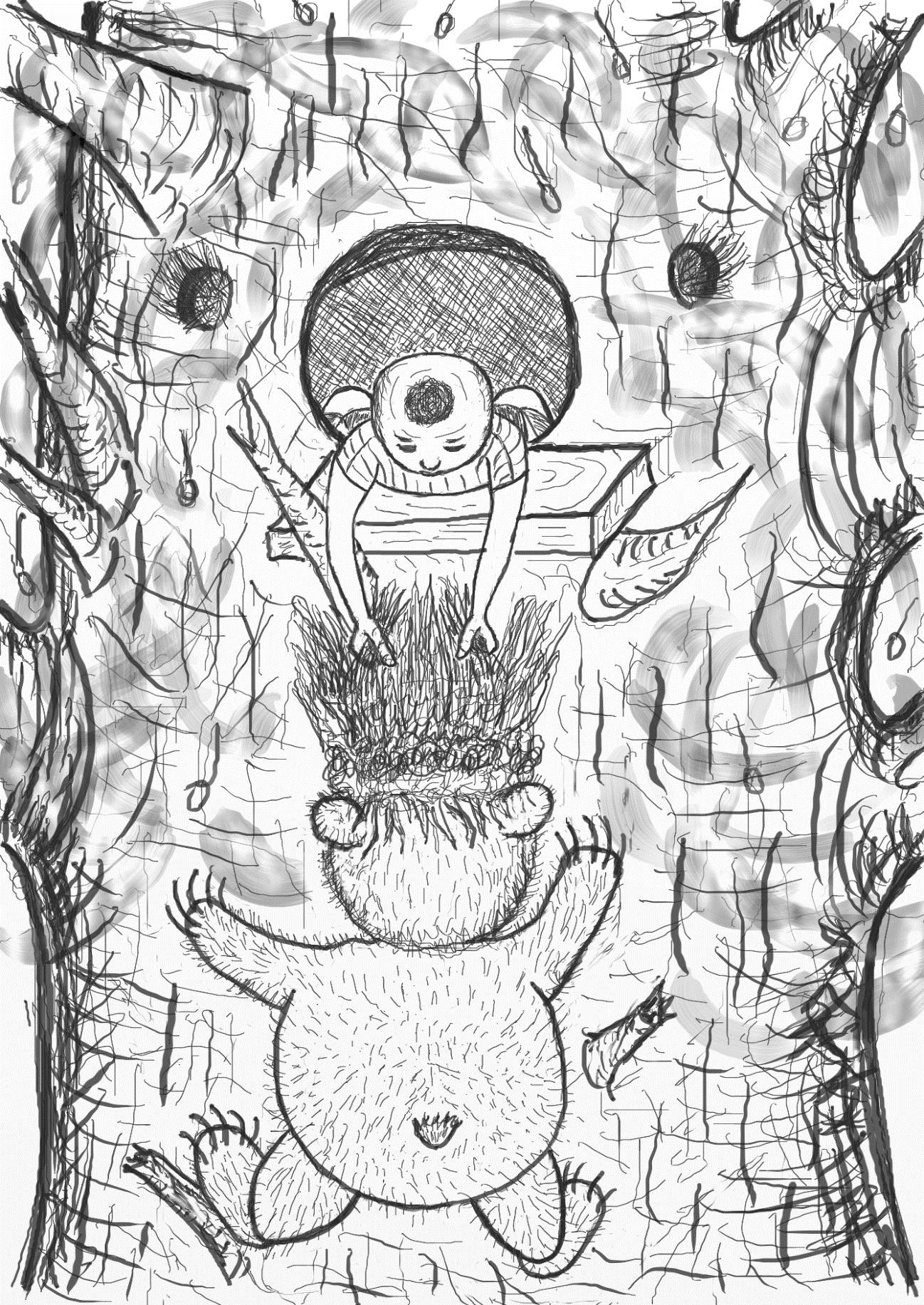 Пока Букася готовил из мха затычки для окошек, да устраивал себе лежанку, медвежонок притащил к дубу здоровенную кочку. Букася выглянул из дупла.