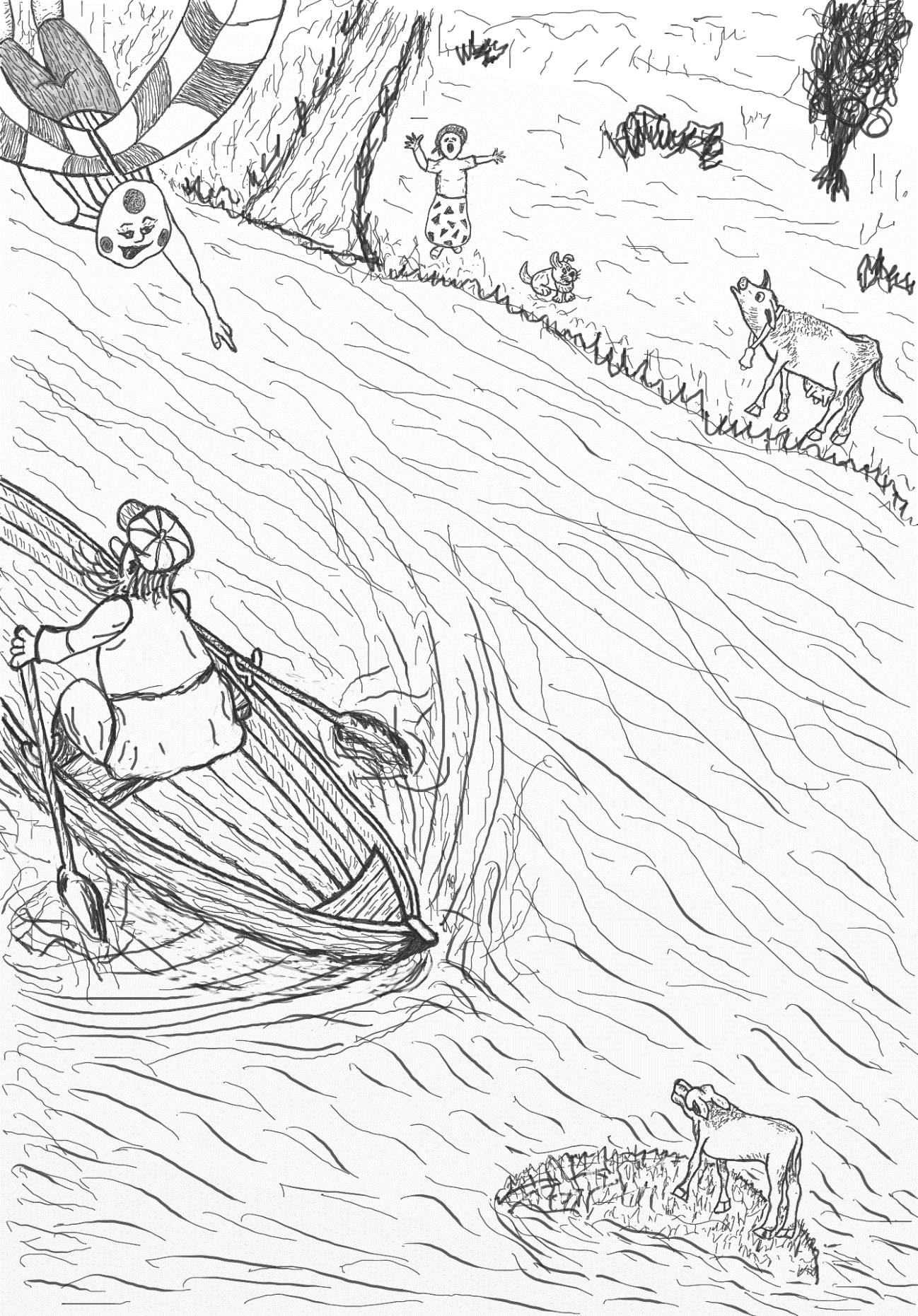 Букася не сразу понял, что произошло, а потом быстро полетел на окраину деревни к деду Пахому. У того была лодка, такая же старая, как и он сам. Дед сидел на завалинке и грелся на солнышке. Когда он узнал, какая беда грозит Муне, не медля, сел в лодку и поплыл. Букася летел впереди и показывал дорогу. Сверху он сразу заметил островок, на вершине которого стоял Муня. Когда лодка ткнулась носом в траву, вода уже подбиралась к телёнку. Муня сам догадался и шагнул в лодку.