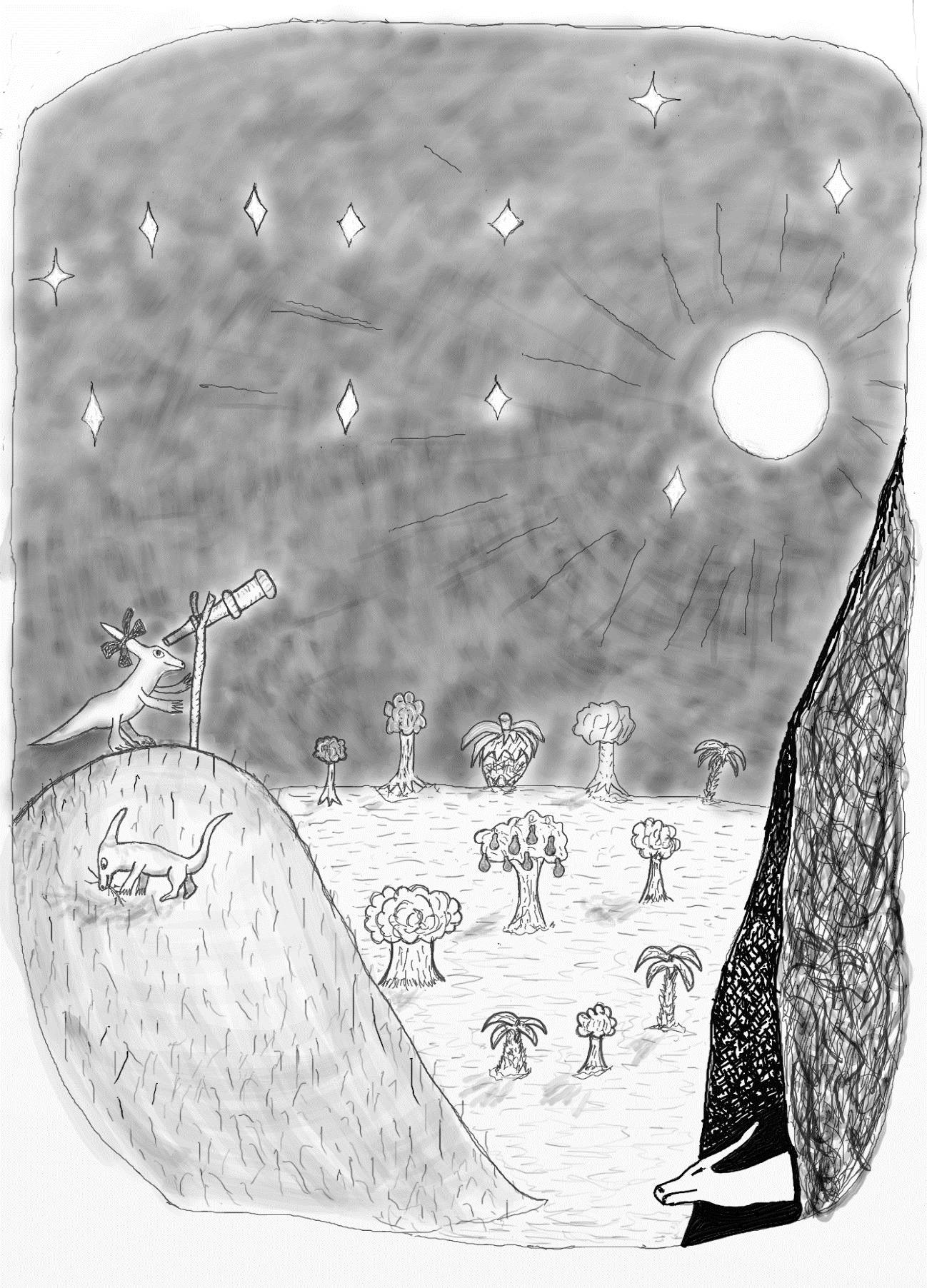 И вот перед ними раскинулась песчаная пустыня. Впереди никакой растительности. Запас груш был уже давно съеден. Теперь только арбузы будут утолять их голод и жажду. Перед всеми возник вопрос, как двигаться дальше? Сластя воскликнула: