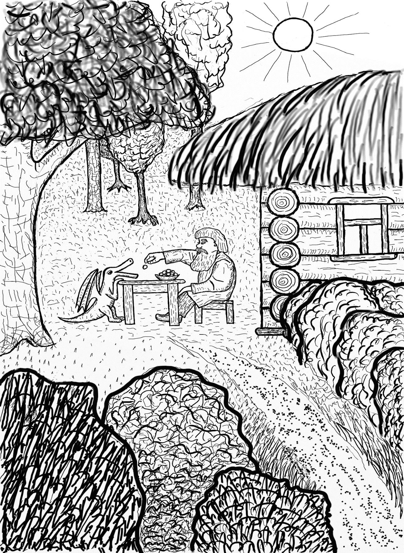 Дальнейший путь шёл через густой кустарник. Пришлось поработать топором, чтобы сделать проход. К счастью, за кустарником они заметили домик лесника, а потом увидели маленького дедушку с большой бородой и Дракошу. На столике перед ними стояла миска, наполненная крупной земляникой. Дедушка Михей бросал душистые ягоды в пасть Дракоши, а тот, поедая их, жмурился от удовольствия.