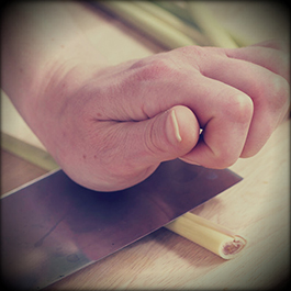 This method is used for preparing fresh ingredients for making paste out of them. It consists in slicing spices into sticks or small cubes to intensify an aroma of fresh spices such as lime leaves, ginger, chili and lemongrass. Lime leaves are cut into small strips; the chili pepper is cut along into two parts and, after removing the seeds, it can be cut in any form; the white part of the lemongrass after, cutting the outer layer, is cut into rings. A large root of ginger or galangal is cut in following way: cut off a piece of necessary size, peel and cut across the fibers (in a form of thin slices, strips or small cubes). In addition to these ingredients, this method is used to prepare various herbs for paste preparation.