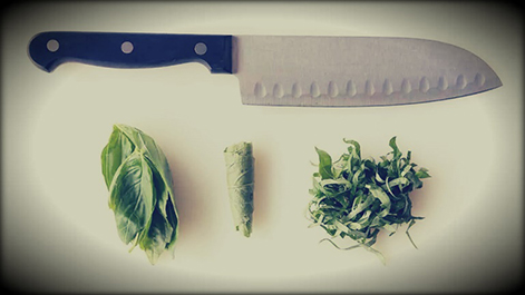 Some cooks prefer shredding fresh herbs into thin strips – chiffonade. If you want to do the same, you need to fold leaves of, for example, basil, mint or oregano into a small pile and roll it into a tube as tight as possible. Then place this tube of leaves on a cutting board and cut it across into thin strips firmly holding the tube.