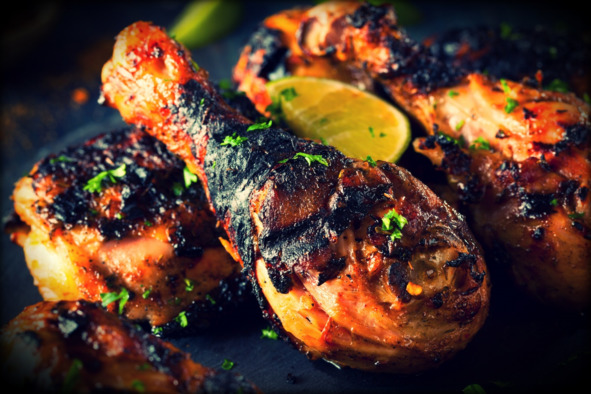 – Разогреть гриль или барбекю. Обжаривать цыпленка в течение 10—15 минут, периодически переворачивая. Убрать голени подальше от углей, закрыть крышкой и оставить на 30 минут. Время приготовления зависит от температуры гриля и углей. В идеале в момент приготовления внутренняя температура цыпленка должна достигать 75 ⁰С.