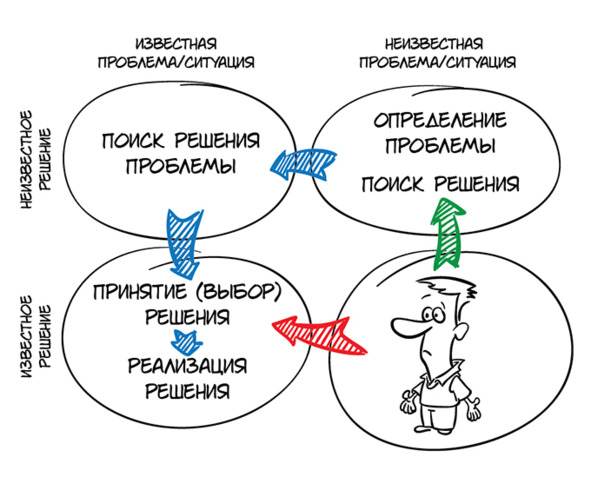 Более творческий квадрант: известная проблема – неизвестное решение. Бывает, что проблема понятна, но как ее решать – совершенно не ясно. В менеджменте это называется «ограниченная проблема». В такой ситуации понятно, в чем заключается проблемная ситуация, кто в нее вовлечен, что вообще происходит. Главный вопрос, который возникает в этом квадранте, – «Откуда мы знаем, что мы знаем, в чем сущность проблемы?». Действительно, очень важный вопрос, которому, кстати, посвящена довольно большая часть этой книги. Давайте пока оставим этот вопрос висящим в воздухе, и для простоты изложения будем считать, что сущность проблемы определена нами правильно и можно приступать к поиску решения. Как с этим работать – обсудим чуть позже.