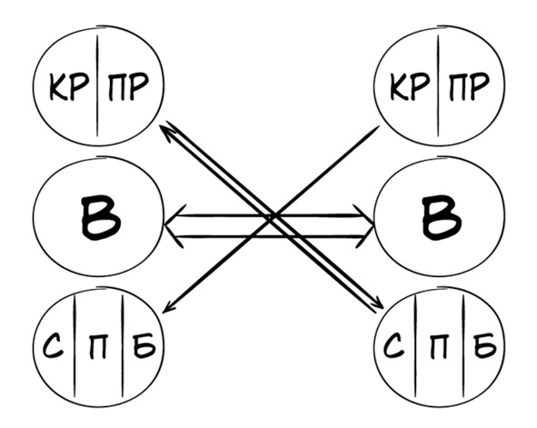 Прежде чем приступить к разговору о коучинговых вопросах, хочется уделить несколько строк коммуникации вообще. Психологи врут, что в каждом из нас внутри как минимум три человека. Хирурги много раз проверяли и утверждают – никаких троих там нет. Но психологи стоят на своем! Великий Эрик Берн в одной из своих книг [8] описал очень интересную модель построения коммуникаций, которую иногда называют «модель снеговика».
