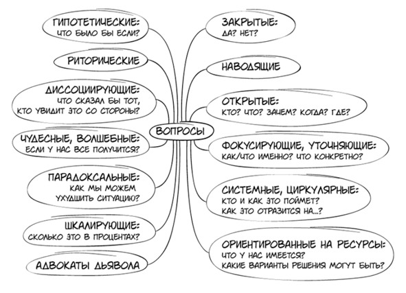 Это особый вариант циркулярных вопросов. «Что сказал бы тот, кто увидит это со стороны?» Основная задача таких вопросов в том, чтобы собеседник диссоциировался с ситуацией, то есть получил бы возможность увидеть ее со стороны. Это позволяет значительно снизить эмоциональный накал и посмотреть на ситуацию более беспристрастно. Зачастую одного этого достаточно, чтобы увидеть ее по-другому и найти пути решения проблемы или достижения цели. Диссоциирующие вопросы.