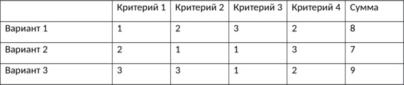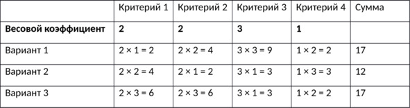 Если мы получили для двух вариантов одинаковые (как в табл. 2) или очень близкие суммы, нам придется выбирать уже из этих двух, уточняя коэффициенты или вводя дополнительные критерии.