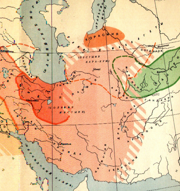 В VII – VI вв. до н. э. в связи с освоением производства железных изделий и с созданием ирригационных систем в приречных низменностях у земледельческого населения Средней Азии начинает складываться классовое общество. Именно в это время возникают поселения городского типа в районе современных городов Самарканда (древняя Мараканда), Мары, Балха (древние Бактры) и в ряде мест Южного Таджикистана. Косвенные указания, извлеченные из более поздних письменных источников, по-видимому подтверждаемые и археологическими данными, свидетельствуют о возникновении к VI в. до н. э. по крайней мере двух крупных объединений, по всей вероятности бывших уже государствами, – Хорезма на нижнем течении Амударьи и Бактрии на верхнем течении Амударьи и ее притоках. Возможно, что влияние их распространялось и шире: Хорезма – на предгорья Копетдага и долину Теджена (быть может, и на Согдиану), Бактрии – на долину Мургаба (Маргиану). В конце II – начале I тысячелетия до н. э. в Северном Иране появляются ираноязычные племена, которые с IX в. под названием мидян начинают упоминаться в ассирийских надписях. Но население наиболее развитых земледельческих областей Северо-Западного Ирана в то время не было еще ираноязычным. Ассирийцы в своих военных походах захватывали здесь большое число квалифицированных ремесленников в качестве военнопленных и использовали их на строительных работах. В VIII в. до н. э. ассирийцы проникают дальше на восток и ведут грабительские походы против мидийских племен, большинство которых было еще кочевыми и полукочевыми.
