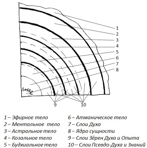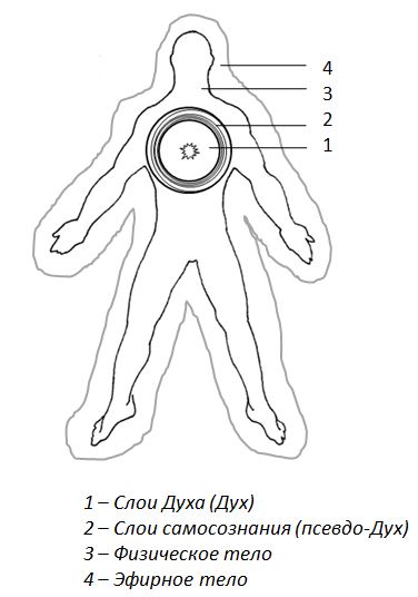 Слоистость сознания человека никакая, в общем-то, не новость. В целом ряде мистических традиций эти слои именуются как тонкоматериальные тела или для краткости тонкие тела человека. Проводя подробный анализ и протестировав эти определения с помощью маятника, мы пришли к выводу, что тонких тел у человека пять штук. Каждое из этих тел настроено на определённые вибрационные характеристики, подобно органам чувств физического тела. Но и на этом разделение восприятия не заканчивается. Дело в том, какие именно задачи призвано решать то или иное тонкое тело, и какой «начинкой» оно оснащено. Для упрощения понимания функционала тонких тел строение псевдо-Духа можно представить как строение полноправной и полноценной Разумной сущности. Итак.