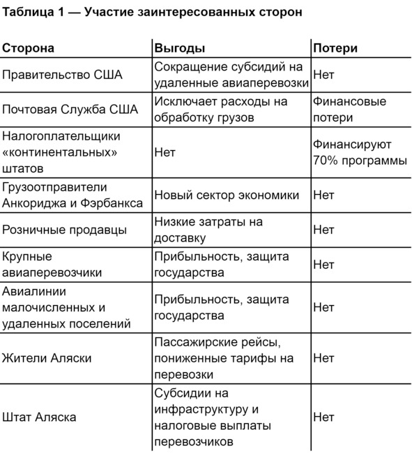 Дополнительное преимущество системы Bypass mail для жителей Аляски заключается в стоимости тарифов на почтовые перевозки. Воздушным транспортом на территории «континентальных» штатов доставляются только грузы премиальной категории, доставка посылок непремиального класса обеспечивается через наземное сообщение (как правило, почтовыми трейлерами)9. Авиаперевозки сокращают затраты по времени10 и, соответственно, стоят дороже. Однако отсутствие развитого наземного сообщения в Аляске делает воздушный транспорт безальтернативным способом надежной доставки. Таким образом, все перевозки любой категории доставляются в общины Аляски самолетами или вертолетами, и жители штата могут, заплатив цену непремиального тарифа, получить посылку в срок как по премиальному тарифу.