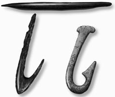 Между тем, как конструкция, рыболовный крючок не всегда был именно крючком, хотя, как приспособление для ловли рыбы, он известен с доисторического периода. Первые его «модели», обнаруженные при раскопках, представляют собой заостренный с двух сторон обломок кости с выточенной поперек канавкой для того, чтобы его можно было к чему-то привязать, и по форме ничего общего с крючком не имели (рис. 3).Прошло не одно тысячелетие, прежде чем это примитивное изделие приобрело привычные очертания. На самом деле достоверно не выяснено, когда рыболовный крючок был изобретен, во всяком случае, в эпоху неолита он уже был и изготавливался из костей, раковин и других подручных материалов.