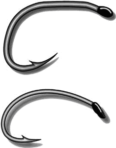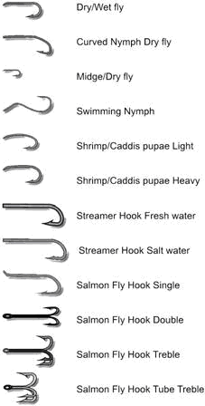С развитием ловли нахлыстом стали изготавливаться крючки, по форме соответствующие тем насекомым, имитацию которых на них вязали, а в настоящее время для искусственных мушек выпускаются специальные рыболовные крючки (fly hook) (рис. 4). Они могут отличаться друг от друга и по весу, и по форме, и, конечно же, по размеру. Существуют изогнутые крючки для вязки имитаций поднимающихся нимф (rising или swimming nymph). Специально выпускаются Собразные крючки для вязки имитаций бокоплава, личинок ручейника (shrimp, klinkhamer, grub, sedge).