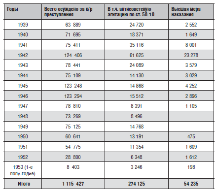 Необходимо особо подчеркнуть, что из общего числа 1 115 427 осужденных за контрреволюционные преступления в период 1939 – первую половину 1953 годов, на годы Великой Отечественной войны 1941–1945 годы приходятся 476 617 осужденных.