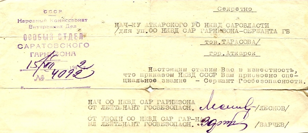Фотография 3. Уведомление о присвоении звания Сержанта ГБ.