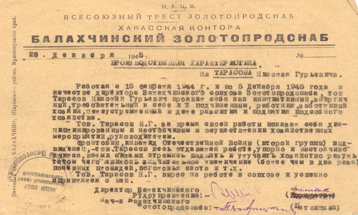 Фотография 6. Производственная характеристика Тарасова Н.Г. Перед переводом на работу в Лабинск.