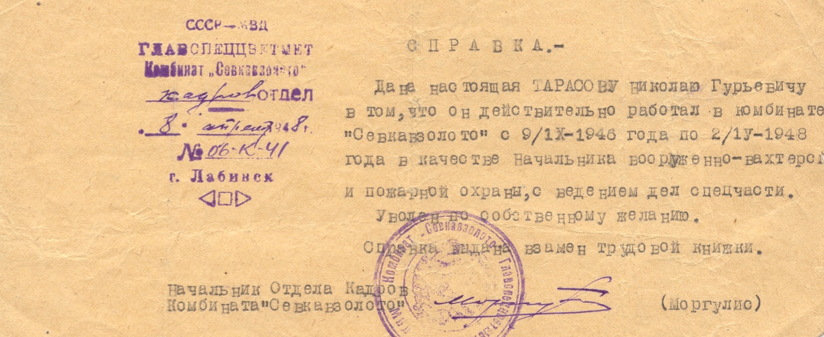 Фотография 7. Справка с места работы, выданная Тарасову Н.Г, в городе Лабинск.