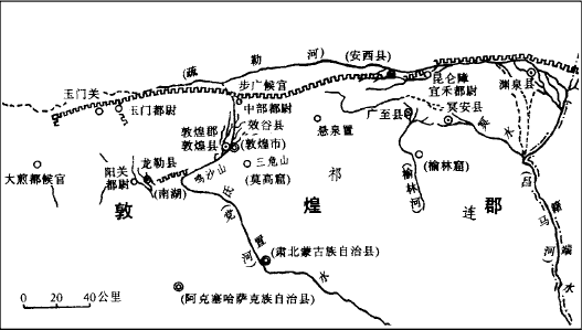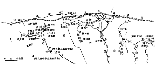 Карта 1. Округ Дуньхуан и Великая китайская стена периода династии Западной Хань («Словарь дуньхуановедения» [ «Дуньхуансюэ да цыдянь»], С. 925)