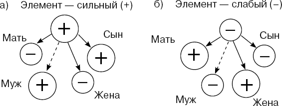 Теперь рассмотрим схему У-син в приложении к одному из элементов. Для удобства рассмотрим элемент «огонь», обозначив его так: «элемент». Все остальные элементы обозначим в полном соответствии связям в схеме У-син: «мать – сын», «муж – жена», «жена – муж».