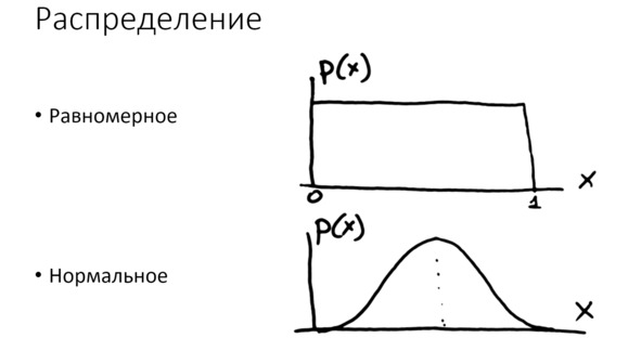 Итак, распределение – это вероятность появления разных значений какой-то случайной величины. На рисунке приведены два примера – равномерное и нормальное распределение. Мы их подробно исследовали на лабораторных работах по статистике.