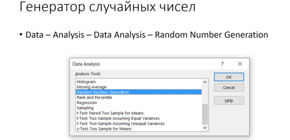 Запускаем генератор случайных чисел. В диалоговом окне указываем число переменных, см. рис. Напомним, что переменные в электронных таблицах и во многих других случаях располагаются по столбцам. Это имеет отношение к истории. Традиционно, задолго до появления компьютеров числа записывали в колонку. Внизу столбца подсчитать сумму. Вручную числа удобно складывать столбиком. Соответственно, и в компьютерах используется традиционное расположение данных. Оно интуитивно понятно.