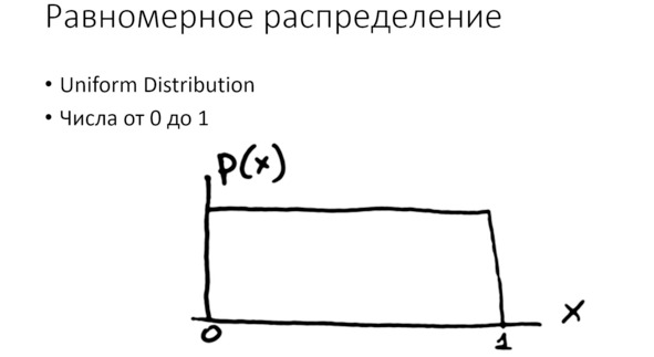 Всё начинается с равномерного распределения. Случайное число от нуля до единицы. Это считается своеобразным стандартом, строительным «кирпичиком» для реализации любого другого распределения.