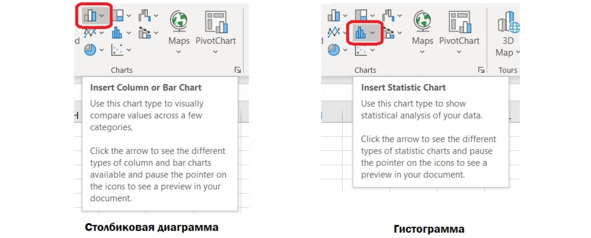 В меню Insert – Chart есть две похожие кнопки: Bar Chart и Histogram.