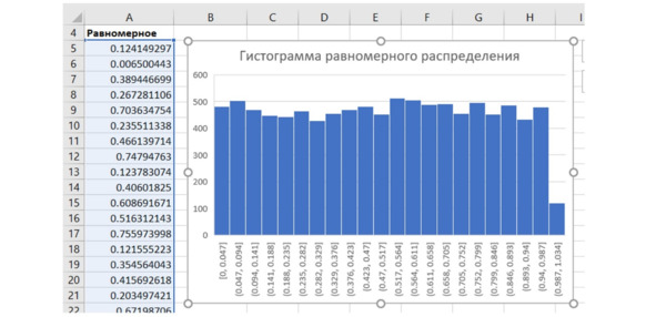 Таким образом, наши данные – от нуля до единицы – сгруппированы по нескольким интервалам. Excel сам автоматически подсчитывает, сколько чисел в какой интервал попадает. Затем строится столбиковый график полученных частот. Так что это особый график со встроенной автоматической обработкой данных.