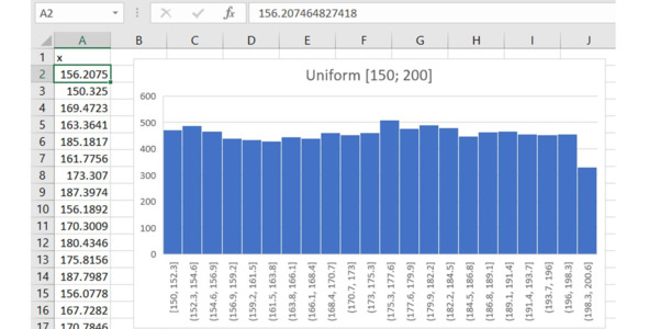 Мы получаем график распределения – «автоматическую гистограмму». В теории все столбики для гистограммы равномерного распределения должны быть одной высоты. Гистограмма по ограниченному набору данных не идеальная. Высота каждого столбика – частота – содержит в себе случайность, небольшую случайную ошибку.