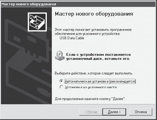 1. Установите переключатель в положение Автоматическая установка (рис. 1.9) и нажмите кнопку Далее. Начнется поиск драйверов для обнаруженного устройства. В приведенном примере этим устройством является сам кабель – USB Data Cable.