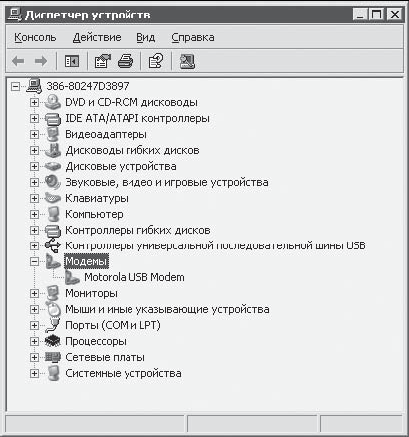 Приведем пример того, как это выглядит на практике. Вскоре после подключения телефона (Motorola C-650) кабелем USB Диспетчер устройств показывает, что в системе появился новый модем Motorola USB Modem (рис 1.11).