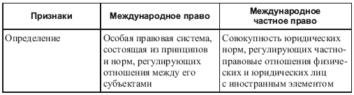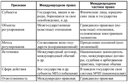 Международное частное право соотносится с международным публичным правом. Так, их общей целью является создание правовых условий для международного сотрудничества в различных областях, обе науки регулируют международные отношения, и международные договоры по МЧП не могут противоречить основным принципам международного права. Различия по разным основаниям можно свести в таблицу.