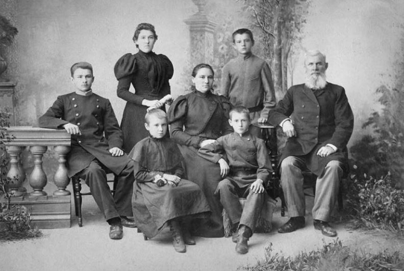 Семья Любимовых. Слева направо: Виктор, стоят Надежда и Владимир, сидят Маруся, Анна Михайловна, Сергей и Павел Васильевич, 1897