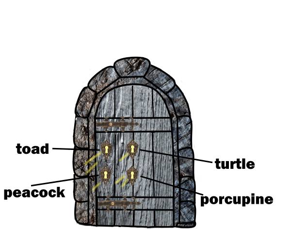 To enter the World of Riddles, you must first open this magic door. Find the right key for each of the four keyholes.