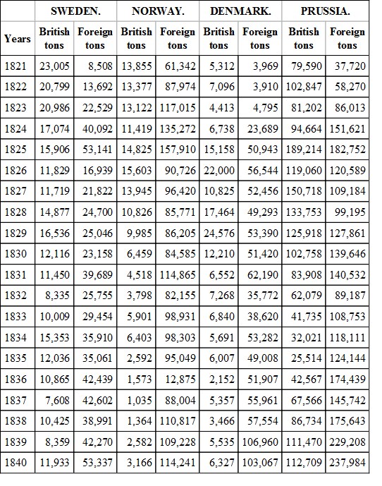 Table showing the British and Foreign tonnage, with Sweden, Norway, Denmark, and Prussia, since 1823, when the reciprocity system began, in each of the following years:—